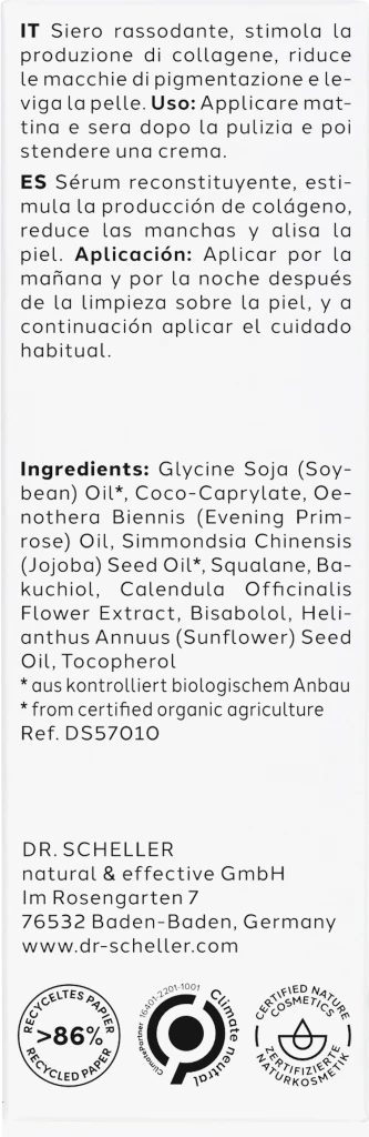 Festigendes Serum, regt die Kollagenproduktion an, mildert Pigmentflecken und glättet die Haut.