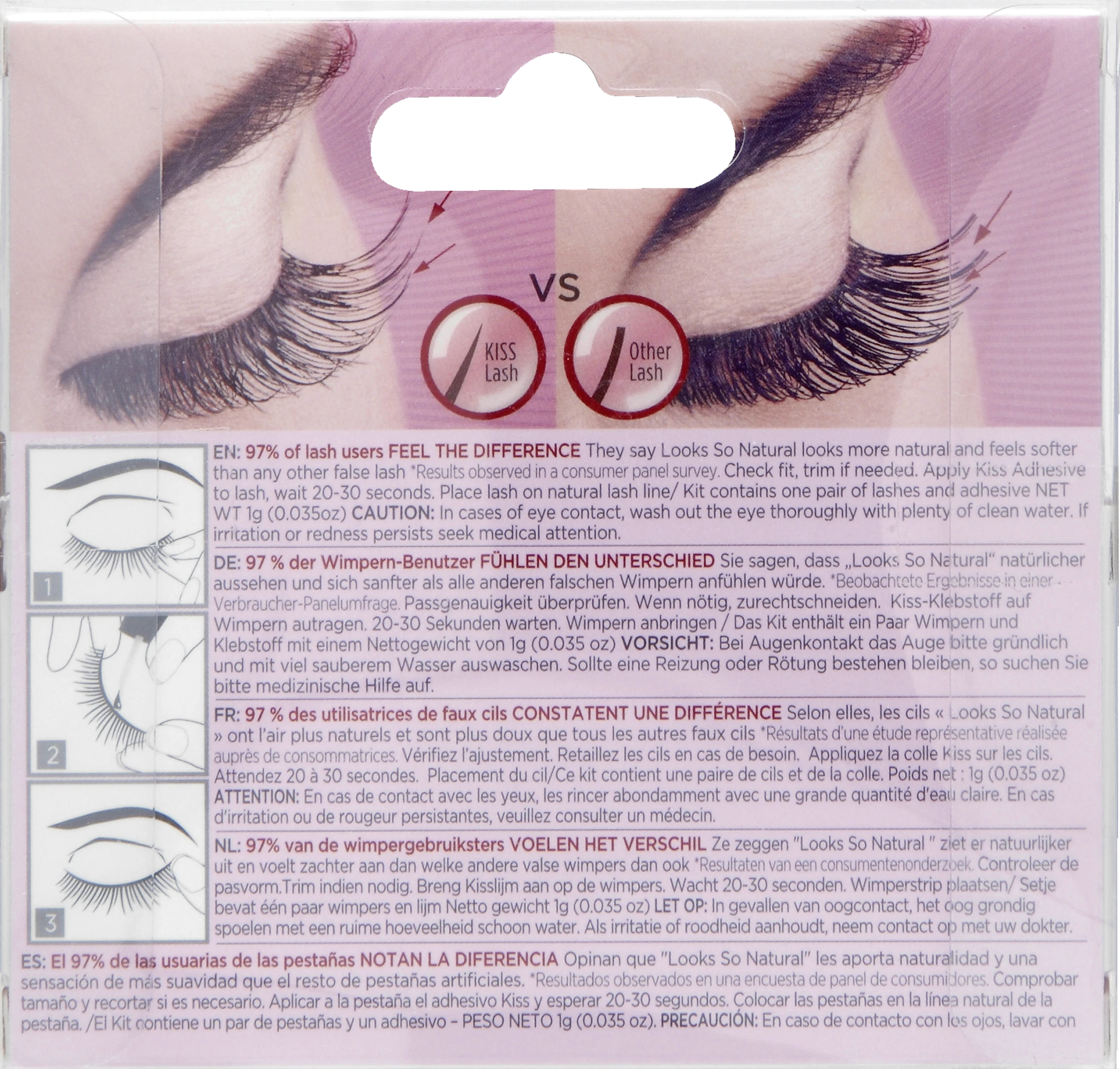 97% der Benutzer FÜHLEN den Unterschied*. Sie sagen, dass “Looks So Natural” natürlicher aussehen und sich sanfter als alle anderen falschen Wimpern anfühlen.